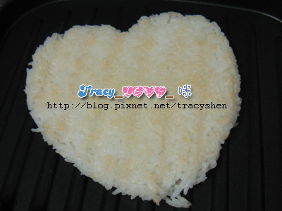 我是把電鍋裡熱熱的飯挖到愛心小蛋糕烤膜裡面壓出形狀