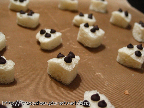 擺上巧克力豆....我本來希望它可以溶化流下去的....結果並沒有..../__\