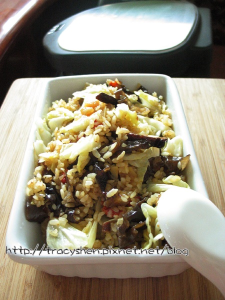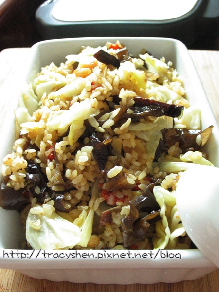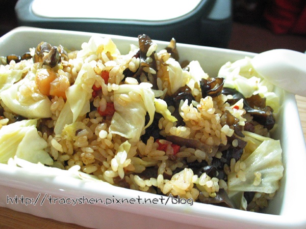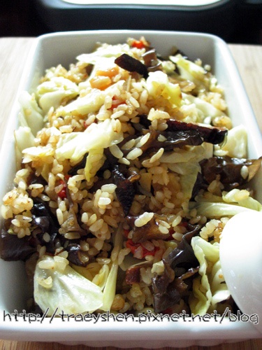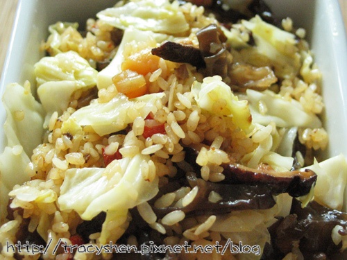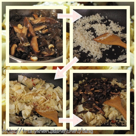 接下來炒米....炒到米變成半透明,加入高麗菜&枸杞